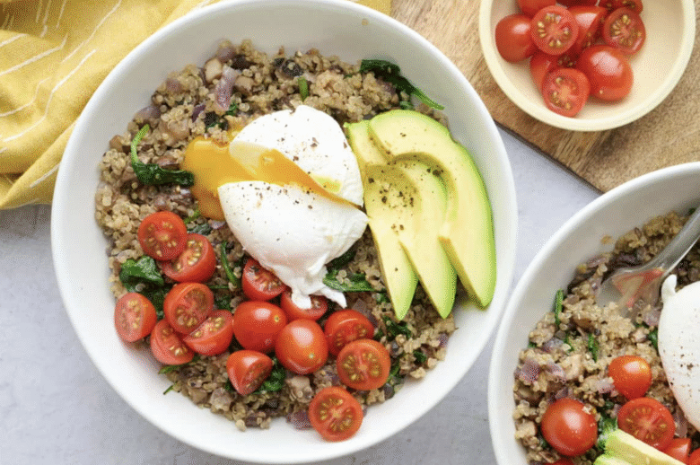 Savory quinoa breakfast bowl with mushrooms, spinach, and poached eggs. A filling way to use quinoa for breakfast.