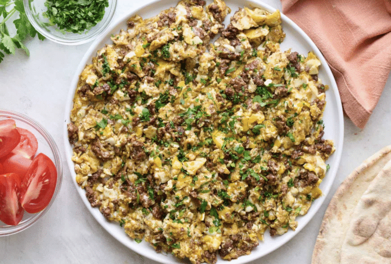This Ground Beef and Eggs recipe has a combo of Mediterranean spices, lean ground beef and eggs scrambled all together in one skillet.