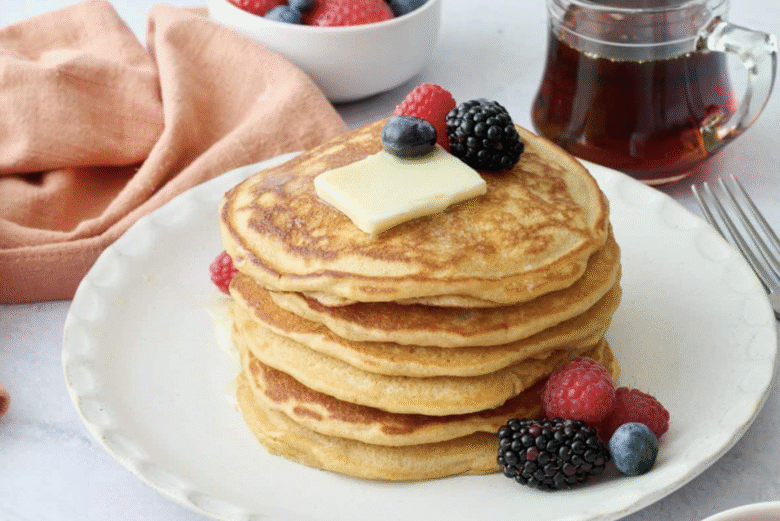 These whole wheat pancakes use maple syrup instead of sugar and are cooked in a skillet for an easy breakfast.