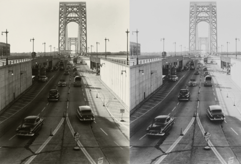 The gelatin silver print photograph, titled “George Washington Bridge, New York,” was created by Berenice Abbott (American, 1898-1991) in 1937 in New York, New York, United States, and was gifted to the J. Paul Getty Museum by Nina and Leo Pircher.