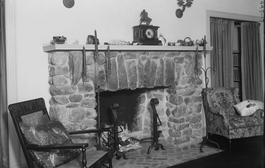 A stone fireplace in country home of opera singer Orville Harrold (1878-1933).
