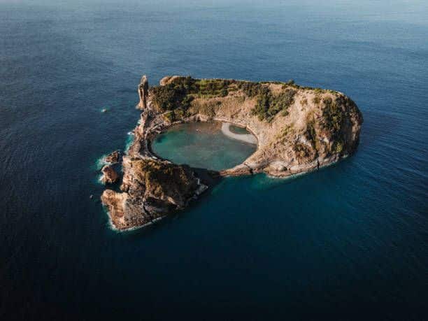 Vila Franca Islet is a tiny island just off the coast of São Miguel in the Azores. It’s actually the top of an old volcano, and the middle part sank in just enough to make a perfect round swimming pool! The water inside is calm and clear because it’s connected to the ocean only through a small opening, making it ideal for swimming, snorkeling, and relaxation.