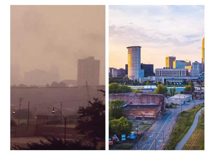 It wasn’t just the water. Smog obscured the Cleveland skyline in this 1973 photo.
