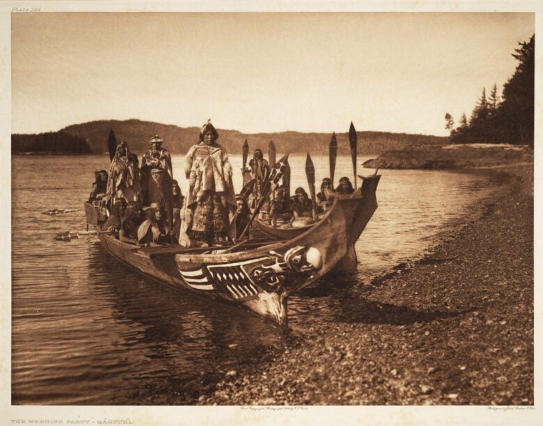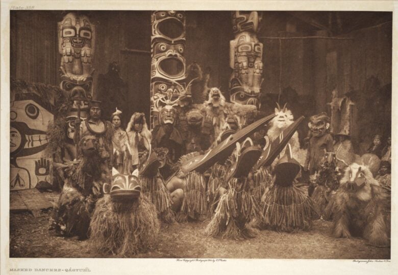 Curtis’s mission to capture the essence and traditions of North American indigenous tribes took him to the far reaches of the continent. Among the tribes he delved into, the Qagyuhl (often spelled Kwakiutl or Kwakwaka’wakw) of the Pacific Northwest stands out prominently. Their vivid and intricate ceremonies, often involving elaborate masks and dramatic dances, provided Curtis with some of his most iconic images.