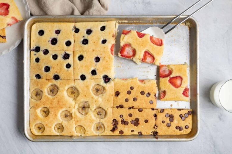 Easy Sheet Pan Pancakes! Just mix the batter in one add to your sheet pan, sprinkle with toppings and bake for 20 minutes.