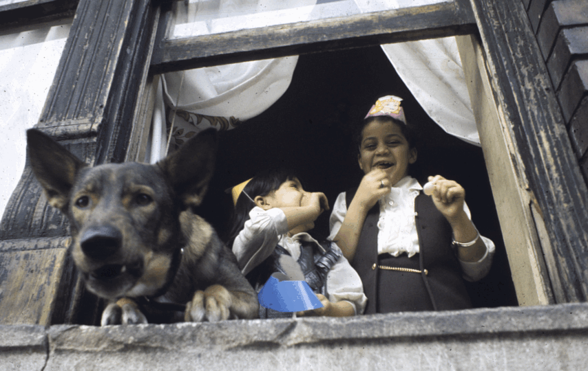 Children wearing party hats and a dog in Williamsburg, 1970.