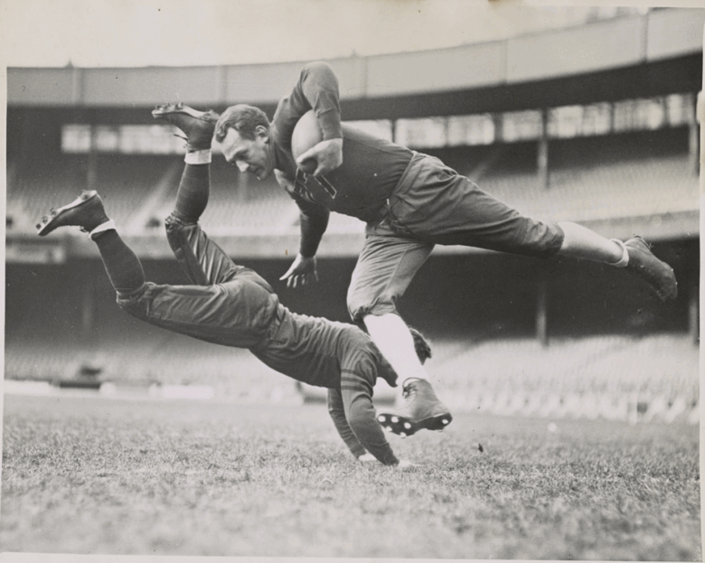Chicago Bears teammates practicing as Joe Zeller tries to tackle Red Grange.