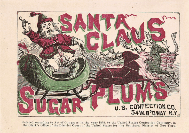 Confection Co., showing Santa Claus on sleigh with reindeer, 1868.