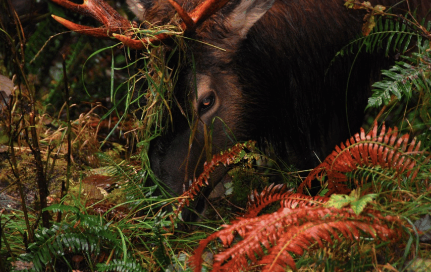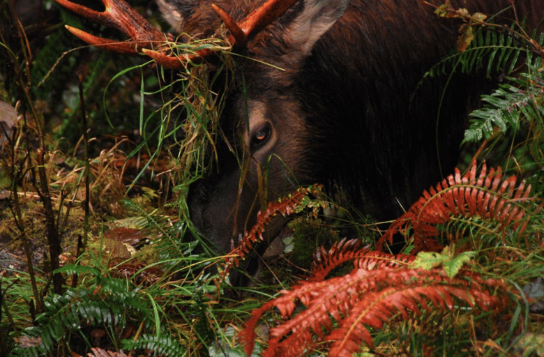 An antlered bull elk among red and green ferns in Hoh rain forest.