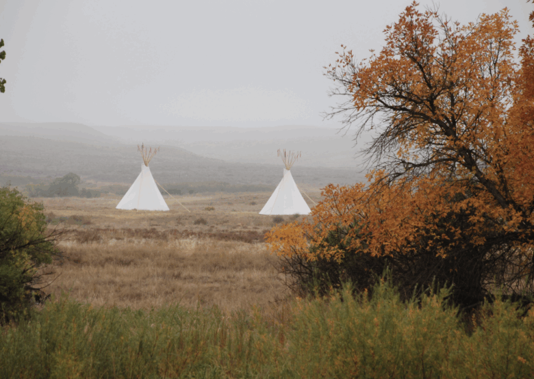Tipis across the Laramie River at Fort Laramie National Historic Site.