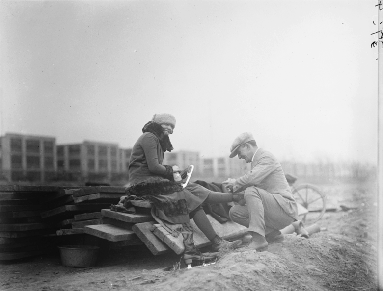 Couple getting ready to ice skate, 1922.