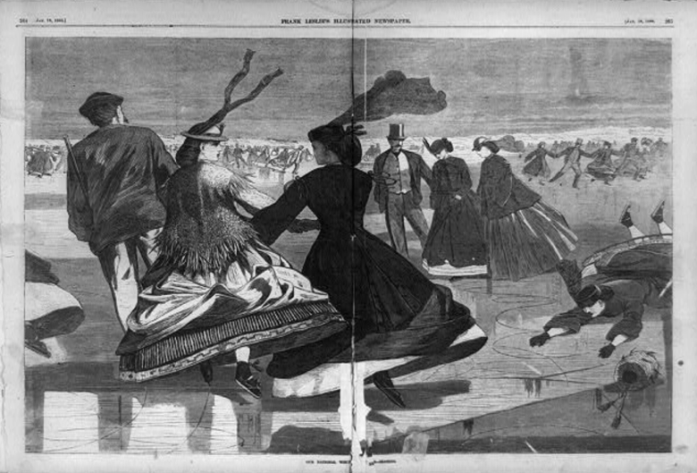 An illustration of people ice skating, published in Frank Leslie’s illustrated newspaper, 1866.