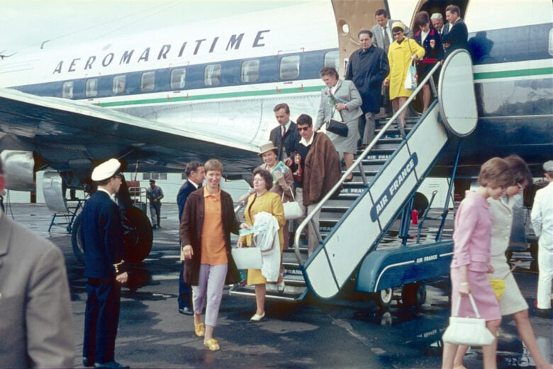 Passengers arriving at Paris via a gangway on the airfield of Paris-Orly, 1966.