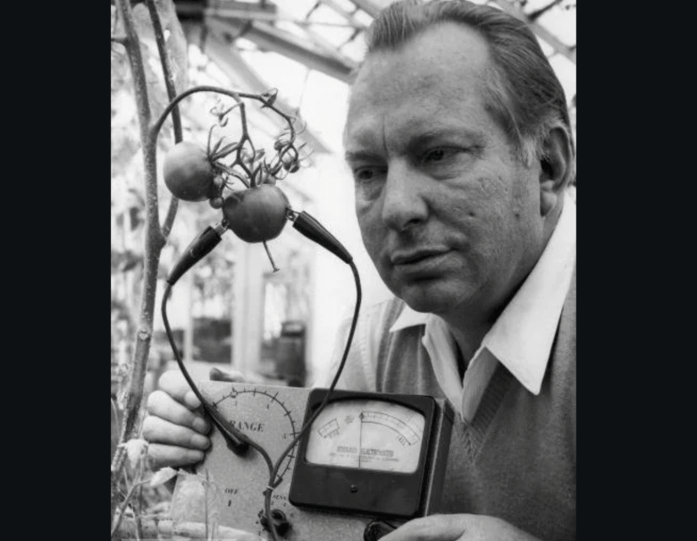 You can see the founder of the E-meter L. Ron Hubbard using it to determine whether tomatoes experience pain, 1968. His work led him to the conclusion that tomatoes “scream when sliced.”
